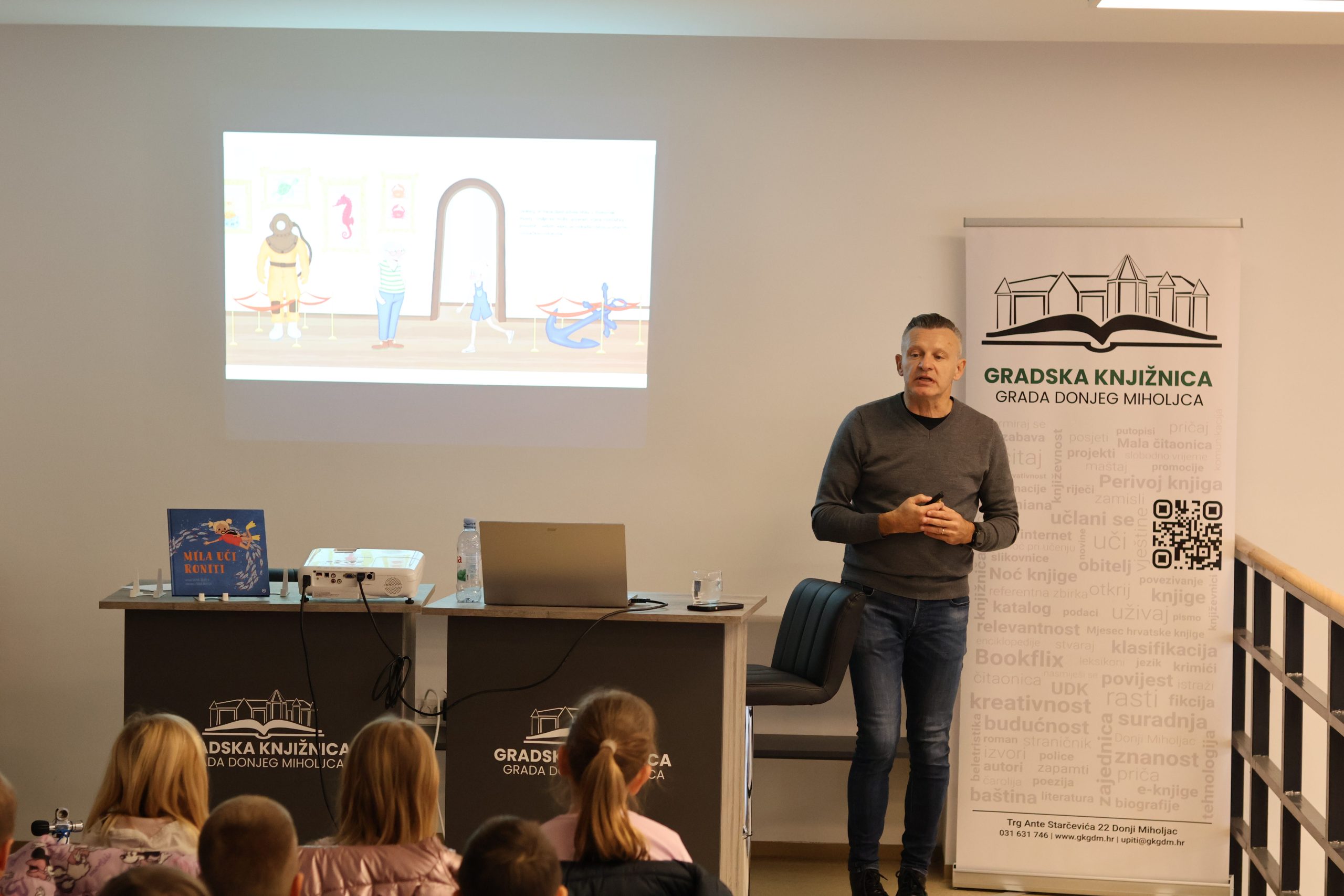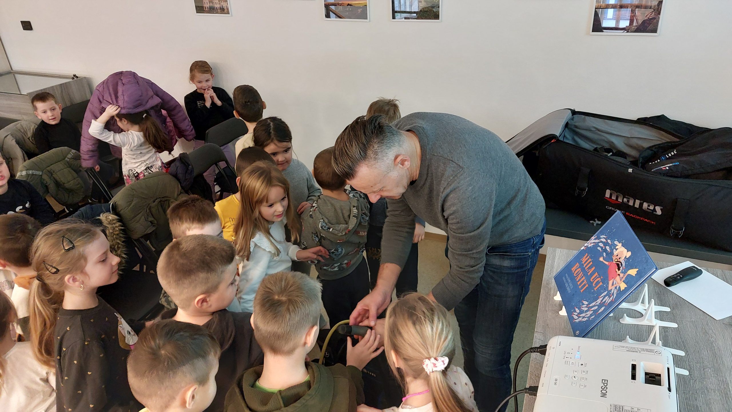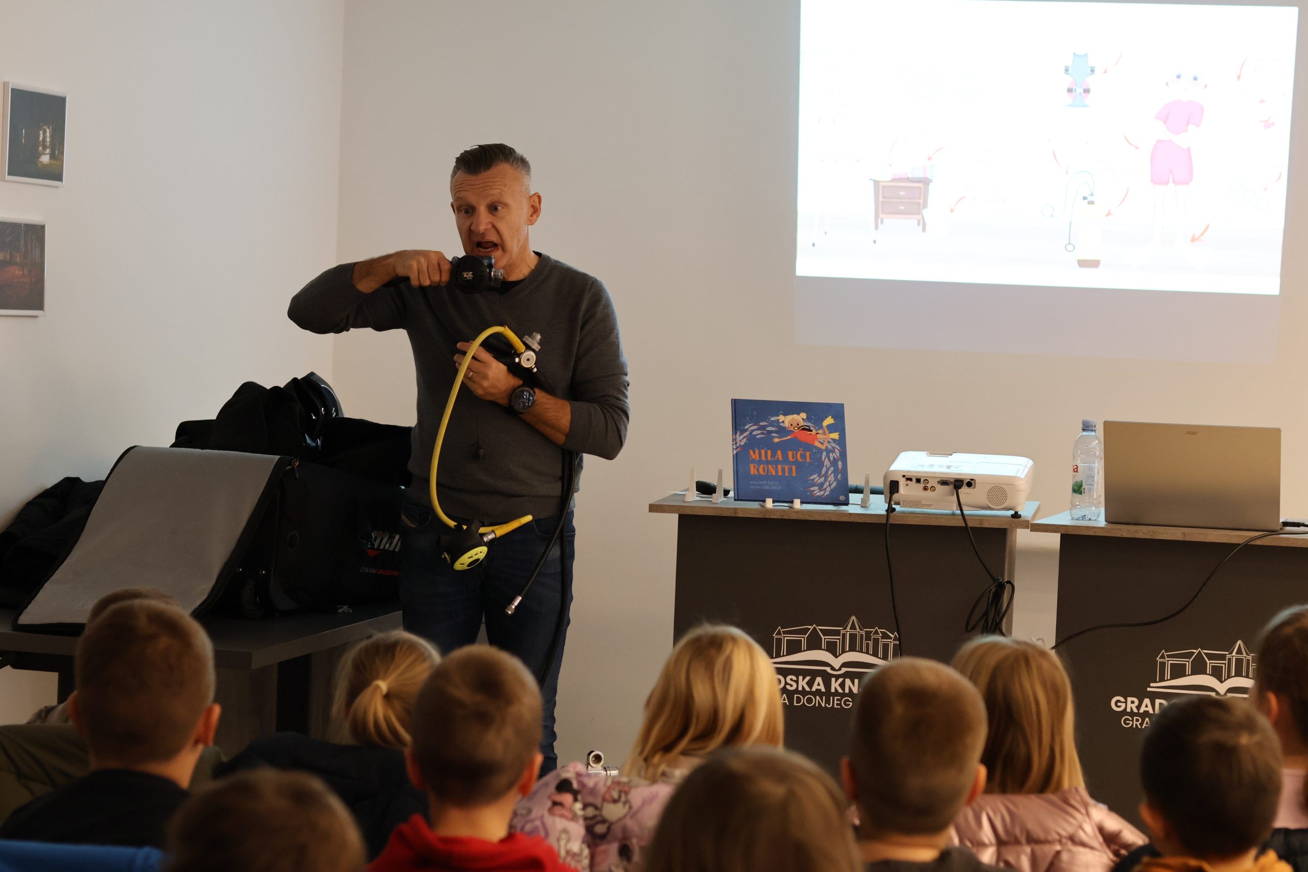 U petak, 28.11. održao je predškolskim skupinama Ježići i Zečići, Dječjeg vrtića Pinokio zanimljivo i edukativno predavanje o ronjenju kroz svoju slikovnicu “Mia uči roniti“, koju je napisao u suradnji sa kćeri. Djeca su se tako imala priliku upoznati s ronilačkom opremom, kroz fotografije otkriti svijet podmorja.