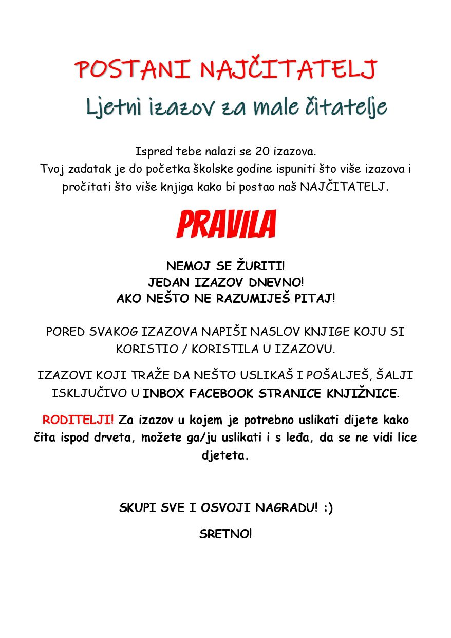 Ovo ljeto pripremili smo posebne izazove za naše najmanje čitatelje. Kako ne bi do jeseni zaboravili čitati i posjećivati knjižnicu, smislili smo kako ćemo vas privući da otkrijete blago među policama dječjeg odjela kroz 20 zanimljivih izazova.